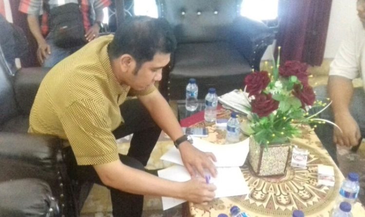 Hendra Pardede anggota DPRD Komisi III Kota Siantar yang juga ketua Tim pemenangan calon Gubernur Sumatra Utara Edy Ramayadi dan Musa Rajeks Shah (Eramas) di Kota Siantar hadir di Kantor Panwaslih Siantar di Jalan Regu, Kecamatan Siantar Sitalasari, Selasa (03/04/18) sore.