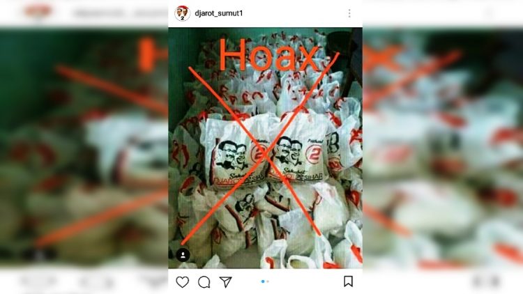 “Melawan HOAX…!!! [KLARIFIKASI] Sehubungan dengan berita yang beredar melalui media sosial maupun aplikasi berbagi pesan, mengenai berita pembagian sembako yang mengatasnamakan relawan Djarot-Sihar (DJOSS) isu tersebut dinyatakan TIDAK BENAR.