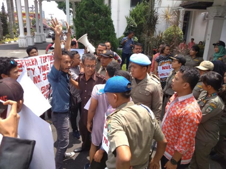 Puluhan massa Sahabat Lingkungan (Saling) gelar aksi unjuk rasa (demo) di kantor Walikota Siantar, Kamis (27/09/2108). Aksi dorong-dorongan antara pendemo dengan personil Sat Pol PP sempat terjadi.