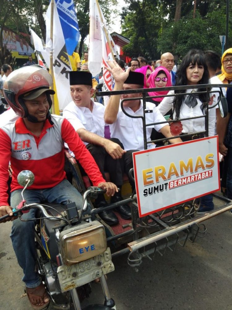 Pasangan Edy-Ijek atau disingkat Eramas tiba di KPU Sumut pukul 10.30. Sebelum berangkat dari rumah pemenangan Edy-Ijeck di Jalan A. Rivai, pasangan ini langsung diarak menggunakan betor.