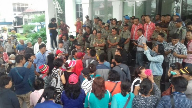 “Kami sudah empat kali kami datang kemari. Kami dapat informasi dari Satpol PP bahwa Walikota masih di jalan menuju gedung walikota,” teriak pedagang.