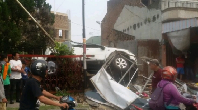 Namun, karena oleng, mobil tersebut naik ke median jalan menabrak pohon dan tiang lampu lalu terbalik dan nyangkut di pagar rumah warga.