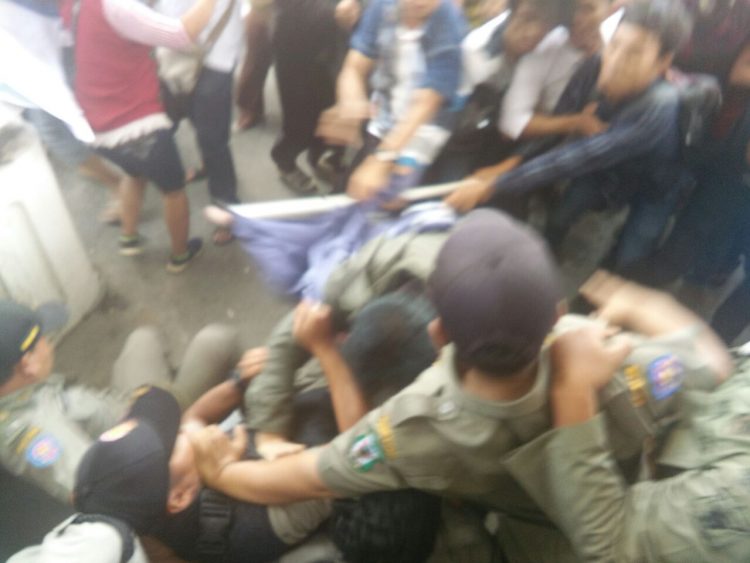 Bentrok terjadi, saat massa pendemo ingin merangsek masuk kantor Walikota. Petugas Sat POl PP yang berjaga, menghadang pergerakan massa yang memaksa masuk.