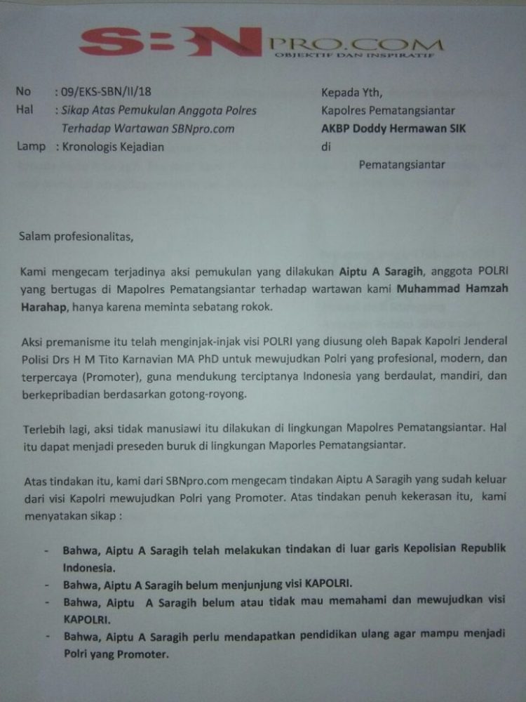 Secara fisik, surat dari redaksi SBNpro.com itu telah disampaikan oleh korban pemukulan, Hamzah Harahap, Minggu (04/02/19), ke Mapolres Pematangsiantar.