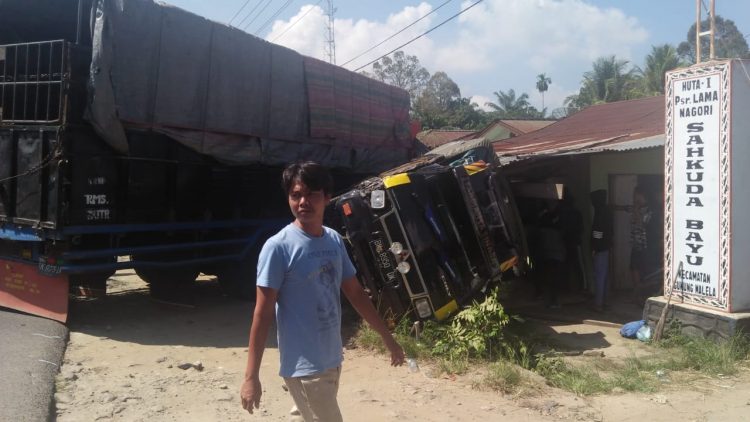Truk Foso ini menyeruduk warung nasi milik Sarimuda Harahap hingga ambruk.(foto/SBNpro/ist)