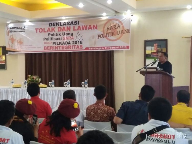 Deklarasi tolak dan lawan politik uang dan politisasi SARA yang diadakan Panwaslu Kabupaten Simalungun, Rabu (14/02/18), di Aula Sing A Song, Kecamatan Siantar, Kabupaten Simalungun bertujuan agar Pilkada Sumut 2018 berintegritas.
