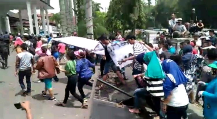 Unjuk rasa berlangsung ricuh. Pintu gerbang kantor Balai Kota ikut jadi korban setelah dirubuhkan para pendemo yang merangsek memaksa masuk ke dalam areal halaman Balai Kota.