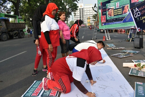 Pantauan, peserta car free day membubuhkan tanda tangan dengan latar kain putih. Mereka antusias berkomunikasi dengan relawan RGR lalu memberikan tandatangan di kain putih yang disediakan relawan.